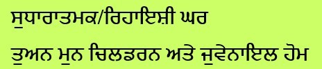 | Correctional / Residential Home Tuen Mun Children and Juvenile Home | ਸੁਧਾਰਾਤਮਕ/ਰਿਹਾਇਸ਼ੀ ਘਰ ਤੁਅਨ ਮੁਨ ਚਿਲਡਰਨ ਅਤੇ ਜੁਵੇਨਾਇਲ ਹੋਮ | |