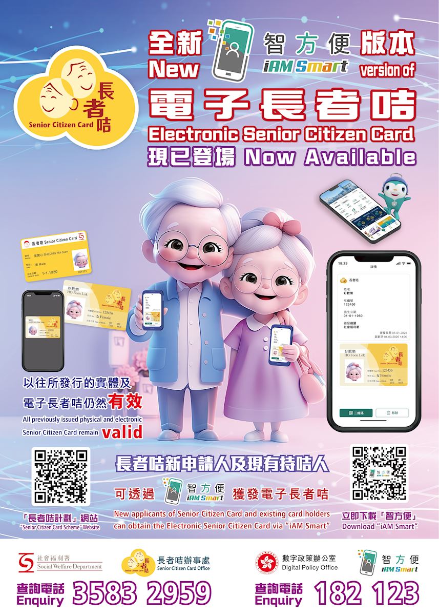 社署已于2025年3月4日,透过数字政策办公室的「智方便」和「认证易」平台推出电子长者咭。长者咭新申请人及现有持咭人均可透过「智方便」流动应用程式加入「智方便」版本电子长者咭,无须额外费用。市民可透过「智方便」流动应用程序展示电子长者卡,其优惠及功能与实体长者卡无异。此外,以往所发行的实体及电子长者咭仍然有效。
