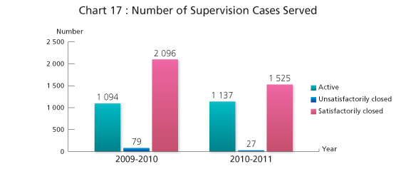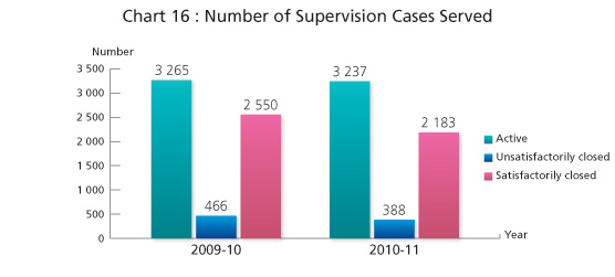 Community-based rehabilitation services include Probation Service, Community Service Orders (CSO) Scheme and Community Support Service Scheme (CSSS). The number of supervision cases served under Probation Service and CSO Scheme as well as the number of membership of CSSS for 2009-10 and 2010-11 are shown in Charts 16 to 18 respectively as follows: |