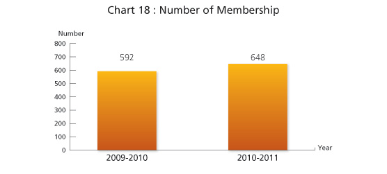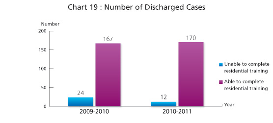 SWD provides residential service and rehabilitation training for juvenile offenders and children in need of care or protection in a purpose-built training complex, the Tuen Mun Children and Juvenile Home, with a capacity of 388. It serves the statutory functions of a place of refuge, a remand home, a place of detention, an approved institution (probation home) and a reformatory school. The number of admissions to place of refuge/remand home/place of detention for 2009-10 and 2010-11 are 3 066 and 2 766 respectively. The number of discharged cases for the approved institution (probation home) and reformatory school for 2009-10 and 2010-11 is shown in Chart 19 as follows: |