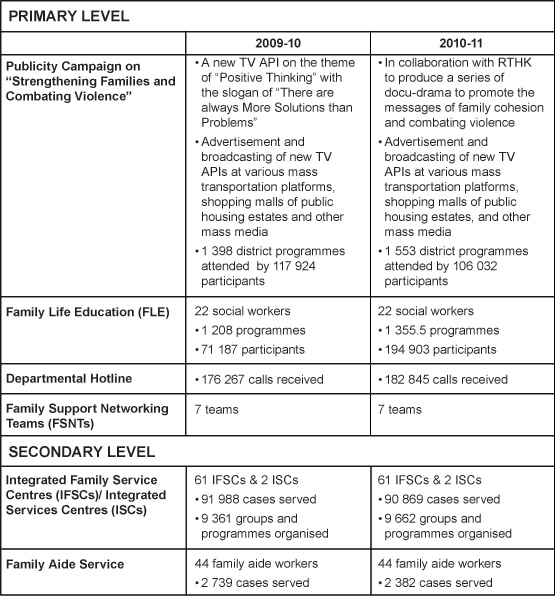 The Social Welfare Department (SWD) adopts a three-pronged approach to provide a continuum of services to support families, namely:
