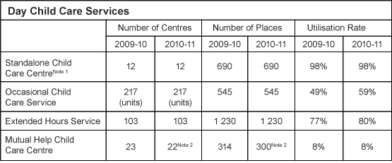 To assist families who cannot take care of their children temporarily because of work or other social reasons, SWD continues to strengthen the provision of flexible child care services and the spirit of mutual help at the neighbourhood level in the community. Under the three-year pilot Neighbourhood Support Child Care Project (NSCCP) first launched in 2008-09, there was one project in each of the 11 SWD districts providing a minimum of 440 child care places with 286 home-based child care places and 154 centre-based care group places. In 2009-10 and 2010-11, the average total number of children served by the 11 projects per month was 453 and 576 respectively.