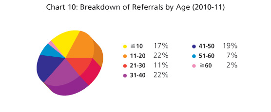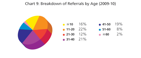 Children and adolescents formed the main client group served by the Clinical Psychologists. They were often victims of physical or sexual violence, cases for custody evaluation, or individuals presenting behavioural or emotional problems which were psychological in origin. Adults were seen for a variety of reasons ranging from mood disorders, chronic difficulties in interpersonal relationships, adjustment problems, sexual deviations, and various forms of offences against the law. Some others might be perpetrators or victims in cases of domestic violence. The breakdown of referrals by age for 2009-10 and 2010-11 is shown in Charts 9 and 10 below: |