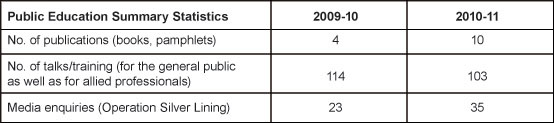 In 2010-11, through Operation Silver Lining, many Clinical Psychologists answered media questions on mental health issues. They also published various books and pamphlets for public education on mental health.