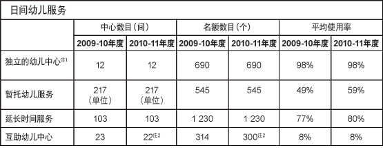 为协助因工作或其他社会因素而暂时未能照顾其子女的父母,社署继续在社区加强具弹性的幼儿服务,并同时提升在社区内邻里间的互助精神。在2008-09年度以试行形式推出为期三年的邻里支援幼儿照顾计划(下称「照顾计划」),社署11个行政分区各有一个照顾计划,合共提供至少440个幼儿照顾名额,包括286个社区保姆服务名额和154个中心托管小组服务名额。在2009-10及2010-11年度,11个照顾计划的每月平均受惠总人数分别为453人和576人。