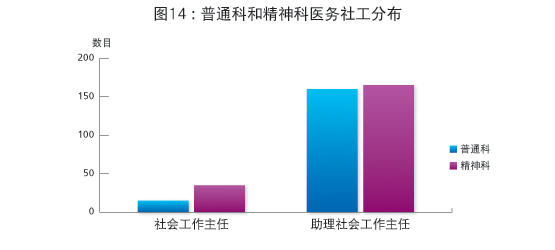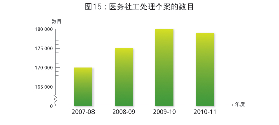 截至2011年3月31日,社会福利署(下称「社署」)共有400名医务社工。在2010-11年度,医务社工共处理约179 000宗个案。普通科和精神科医务社工分布(图14)及医务社工由2007-08至2010-11年度处理个案的数目 (图15)如下: |