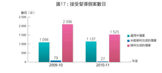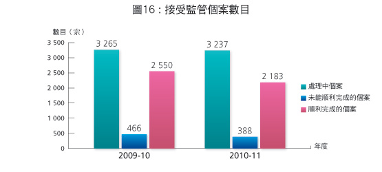 社區康復服務包括感化服務、社會服務令計劃及社區支援服務計劃。在2009-10及2010-11年度,根據感化服務和社會服務令計劃接受監管和督導的個案數目,以及社區支援服務計劃會員人數分別如下(圖16至18): |