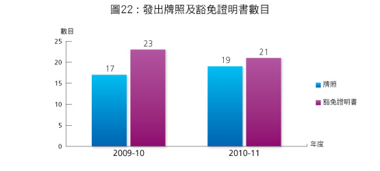 《藥物倚賴者治療康復中心(發牌)條例》(第566章)旨在確保藥物倚賴者可在管理妥善和安全的環境中接受服務。根據此條例,所有治療中心均須以申領牌照或豁免證明書的方式接受規管(後者只適用於在條例生效前,即2002年4月1日前已開始運作的治療中心)。在2009-10及2010-11年度,社會福利署(下稱「社署」)根據上述條例向40間受政府資助或自負盈虧及非牟利的治療中心,發出或續發牌照/豁免證明書的數目分別如下(圖22): |