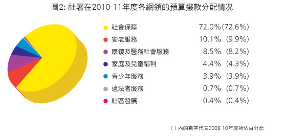 在2010-11年度,社署的實際開支總額為394億元。在這394億元當中,276億元(70%)為經濟援助金註2,86億元(22%)為提供予非政府機構的經常資助,8億元(2%)為僱用服務的開支,其餘24億元(6%)為部門開支。