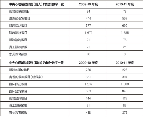 下表顯示中央心理輔助服務在2009-10及2010-11年度分別為康復服務單位提供服務的數字: