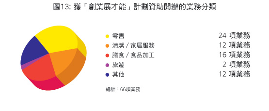 「創業展才能」計劃旨在直接為殘疾人士創造職位,增加他們的就業機會。計劃透過向非政府機構提供一筆種子基金,支持有關機構開辦小型業務,條件是每項業務的全部受僱人員中,須有不少於50%為殘疾人士。截至2011年3月31日,計劃已資助66項業務,包括清潔、麵包工場、生態旅遊、膳食服務、汽車美容、流動按摩、零售店鋪、蔬果批發及加工和旅遊服務等。這些業務共創造了700多個就業機會,當中包括超過520個為殘疾人士而設的職位。業務分類(圖13)如下: |