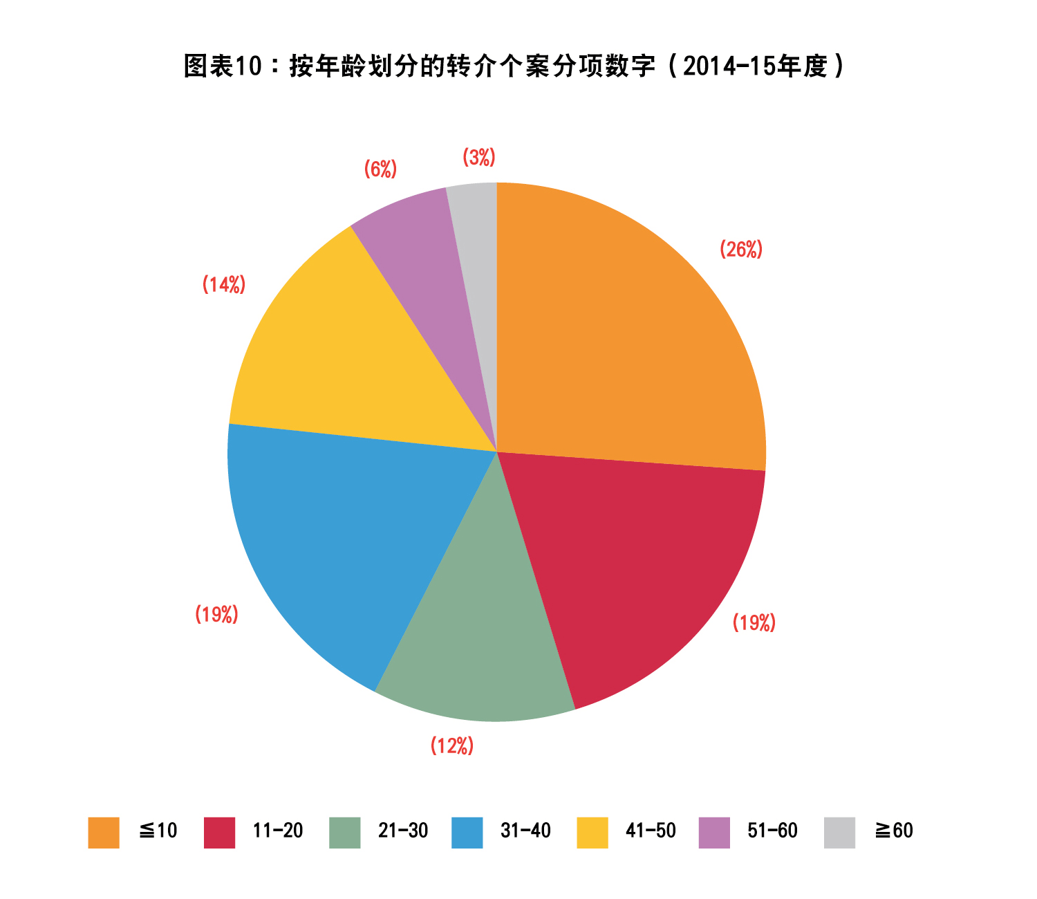 儿童及青少年是接受临床心理学家服务的主要羣体,他们常是暴力或性暴力受害者、管养评估的个案当事人,或有源自心理因素的行为或情绪问题的人。成年人接受服务的原因甚多,包括情绪病、人际关系长期欠佳、适应困难、性偏差,以至各类触犯法例的罪行等。部分服务使用者则可能是家庭暴力个案的施虐者或受害人。2013-14及2014-15年度按年龄划分的转介个案分项数字如下(图表9及10):