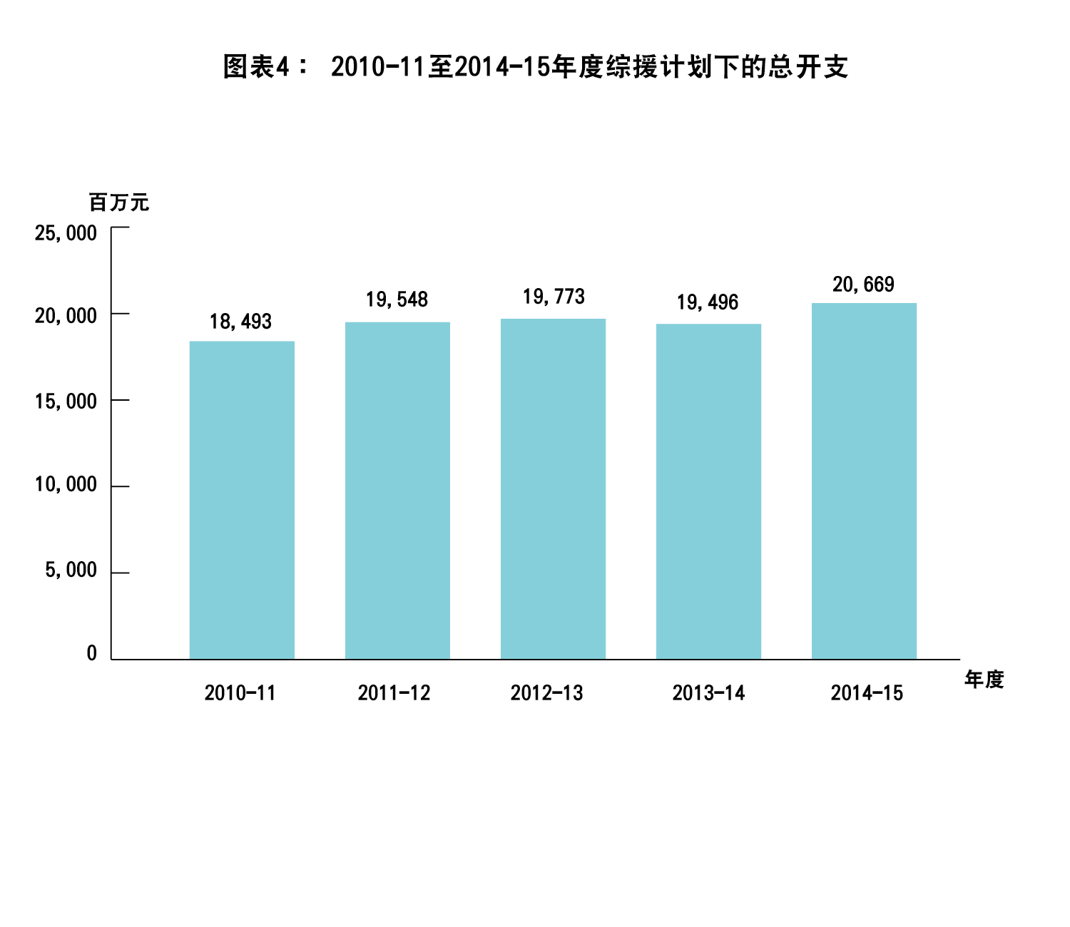 在2014-15年度,在综援计划下发放的款项达206.69亿元。2010-11至2014-15年度的总开支如下(图表4):