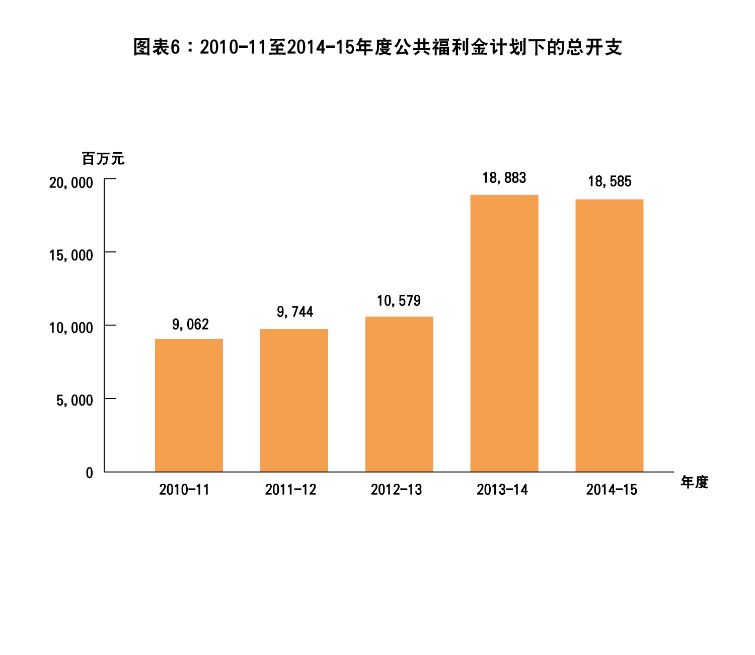 在2014-15年度,在公共福利金计划下发放的款项达185.85亿元。2010-11至2014-15年度的总开支如下(图表6):