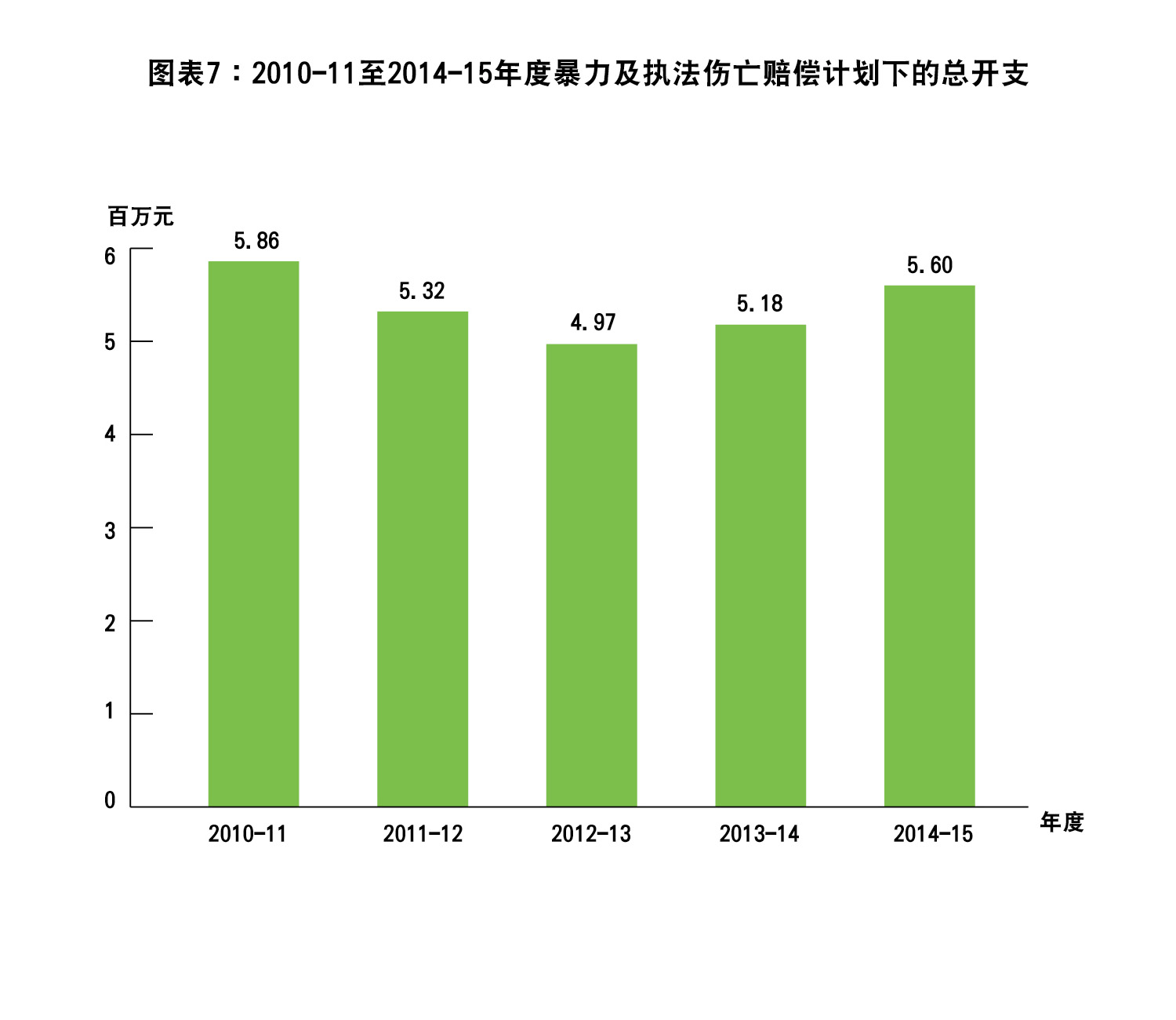 在2014-15年度,在暴力及执法伤亡赔偿计划下发放的赔偿金达560万元,涉及个案共368宗。2010-11至2014-15年度的总开支如下(图表7):