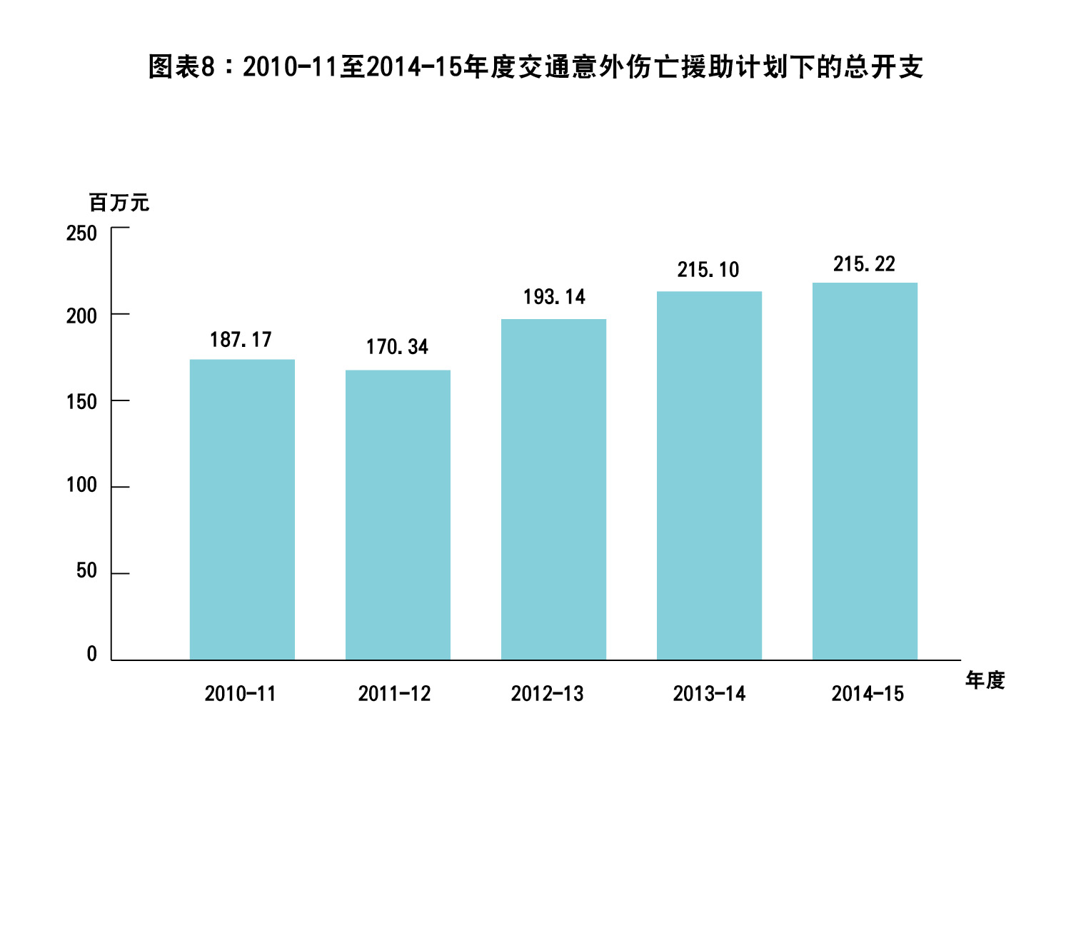 在2014-15年度,在交通意外伤亡援助计划下发放的援助金达2.1522亿元,涉及个案共13 229宗。2010-11至2014-15年度的总开支如下(图表8):