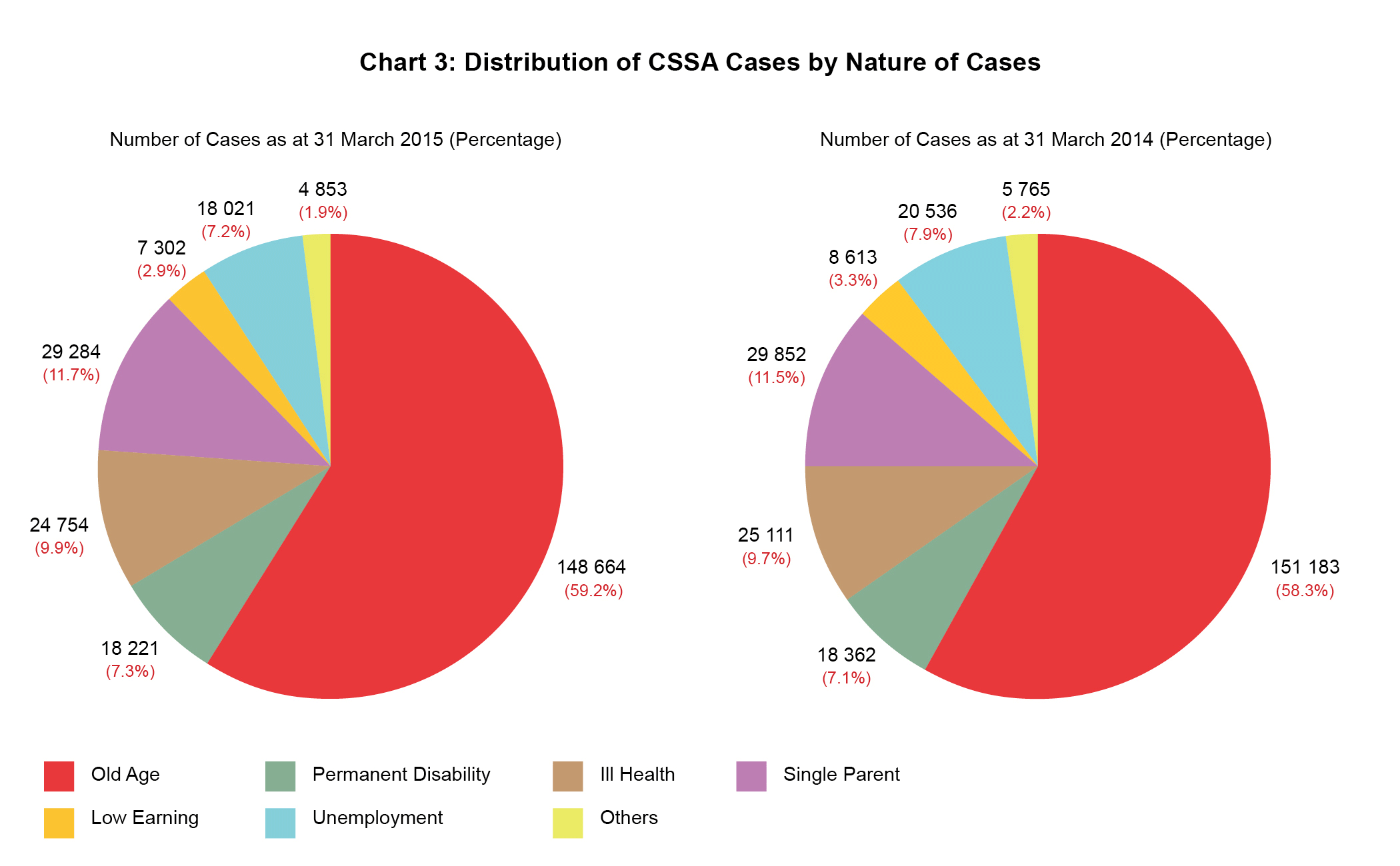 As at 31 March 2014, there were 259 422 CSSA cases providing assistance to 393 353 people. The number of CSSA cases and recipients were 251 099 and 377 460 respectively as at 31 March 2015. The number of CSSA cases decreased in the past two years. Analysis of distribution of CSSA cases by nature of cases as at 31 March 2014 and 31 March 2015 respectively is shown in Chart 3 below: