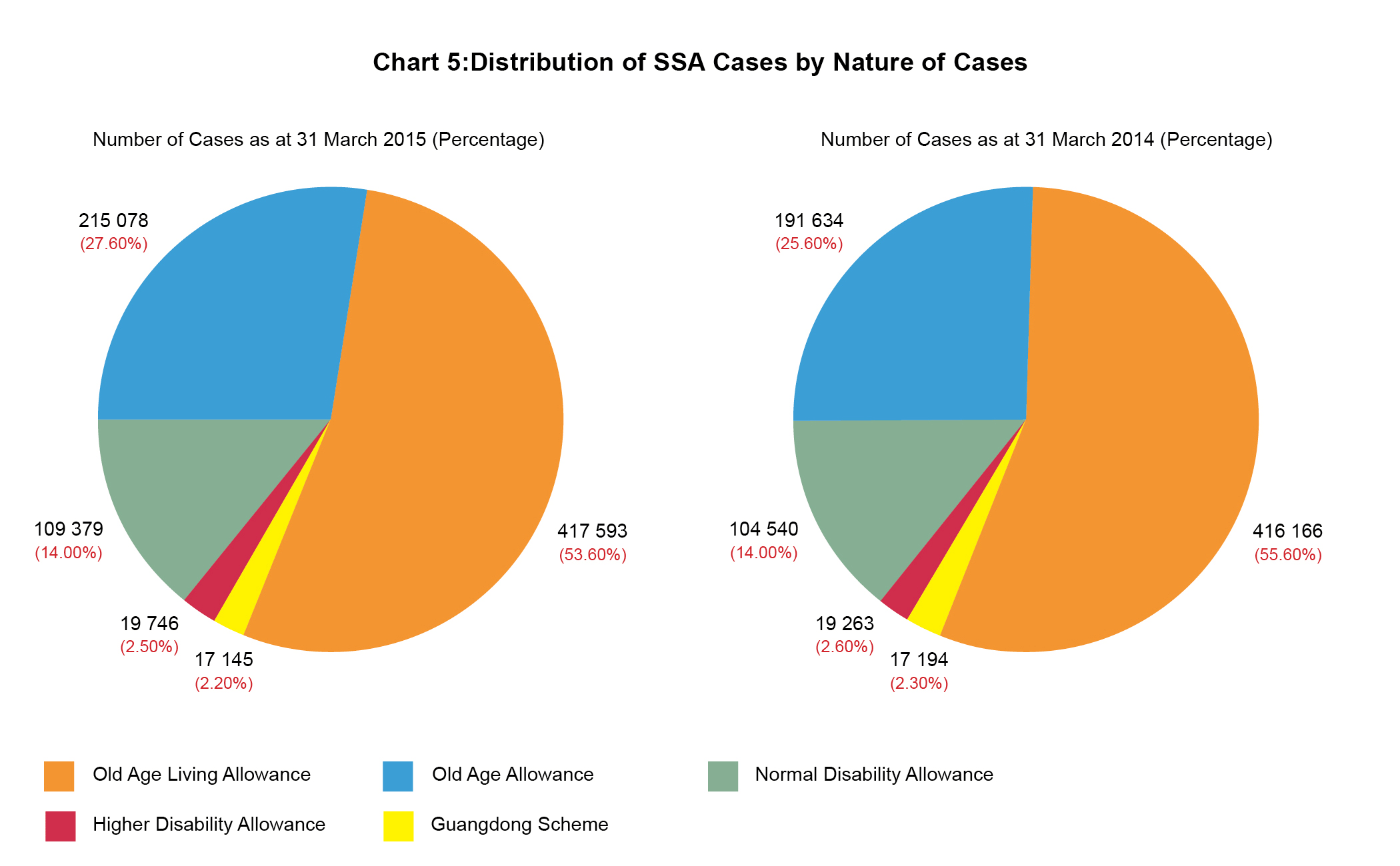 As at 31 March 2014 and 2015, the numbers of SSA cases were 748 797 and 778 941 respectively. A breakdown of these cases by nature of cases is shown in Chart 5 below:
