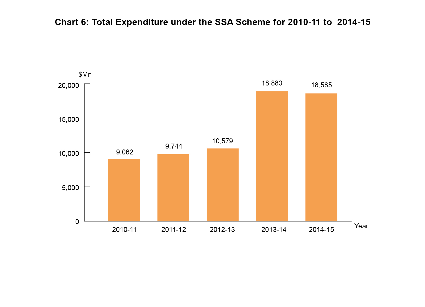 A total of $18,585 million was paid out under the SSA Scheme in 2014-15. The total expenditure for the years 2010-11 to 2014-15 is shown in Chart 6 below: