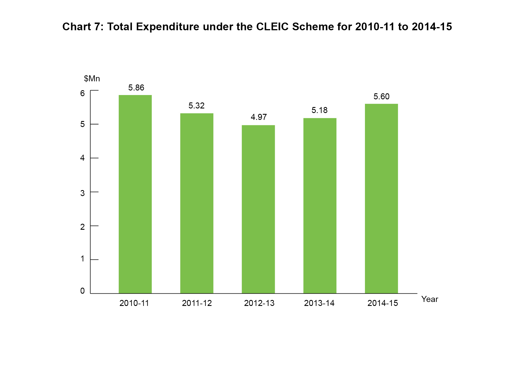 In 2014-15, a total of $5.6 million was paid out under the CLEIC Scheme to 368 cases. The total expenditure for the years 2010-11 to 2014-15 is shown in Chart 7 below: