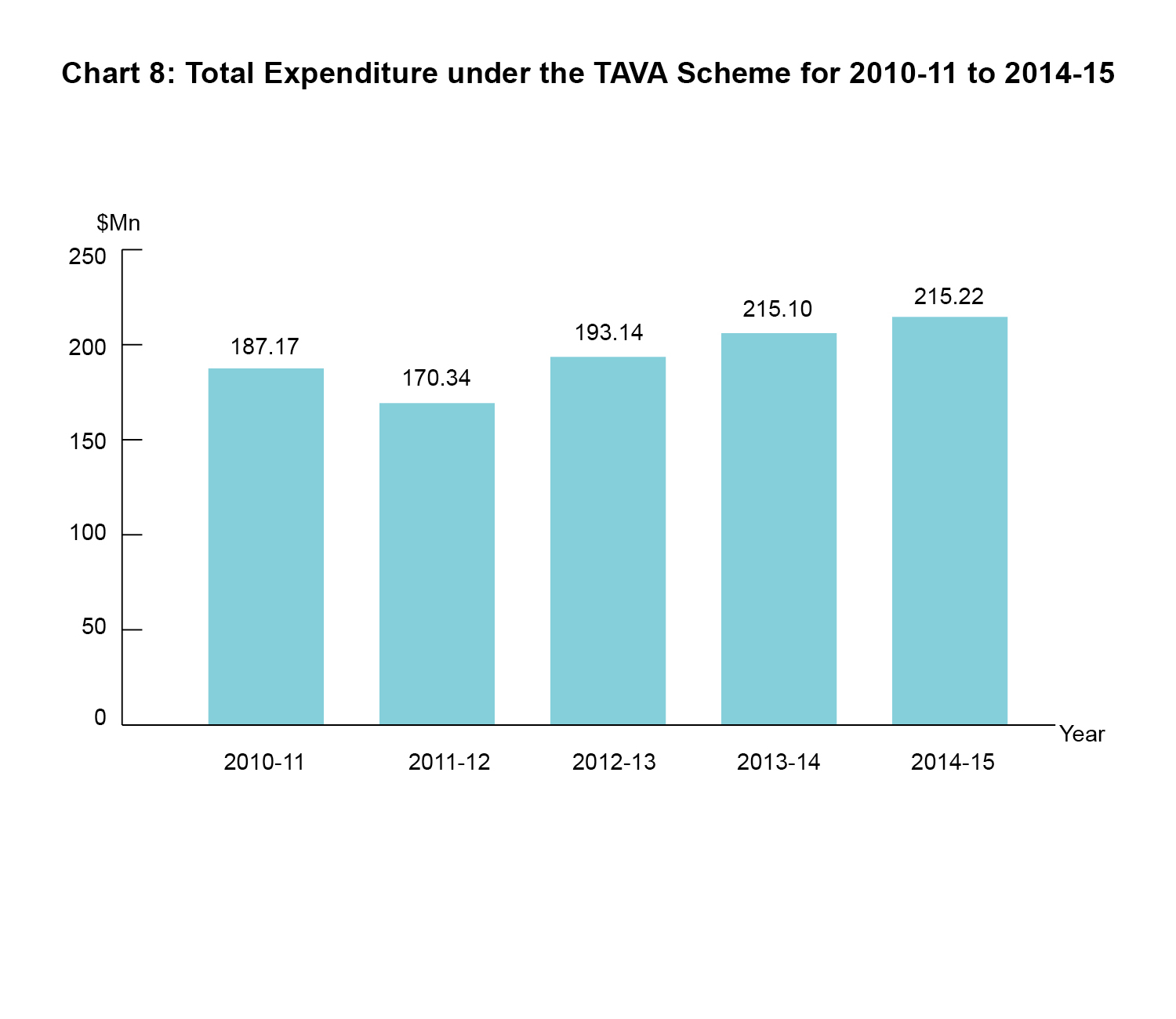 In 2014-15, a total of $215.22 million was paid out under the TAVA Scheme to 13 229 cases. The total expenditure for the years 2010-11 to 2014-15 is shown in Chart 8 below: