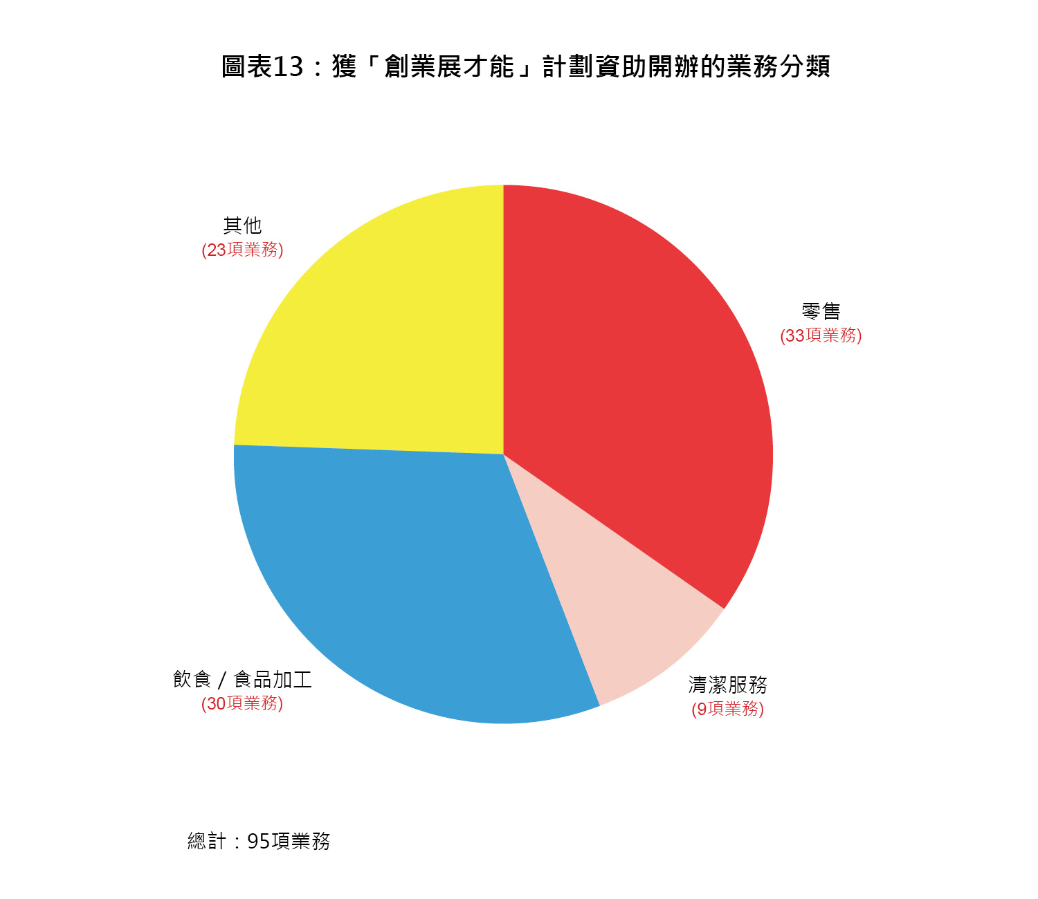 - 「創業展才能」計劃旨在直接為殘疾人士創造職位,增加他們的就業機會。計劃透過向非政府機構提供一筆種子基金,以開辦小型業務,條件是每項業務的受薪僱員總數中,須有不少於50%為殘疾人士。截至2015年3月31日,「創業展才能」計劃已資助95項業務,包括清潔、飲食、生態旅遊、汽車美容、盲人按摩、零售店服務、蔬果批發及加工等。這些業務共創造了一千多個就業機會,當中包括超過710個為殘疾人士而設的職位。業務分類如下(圖表13):