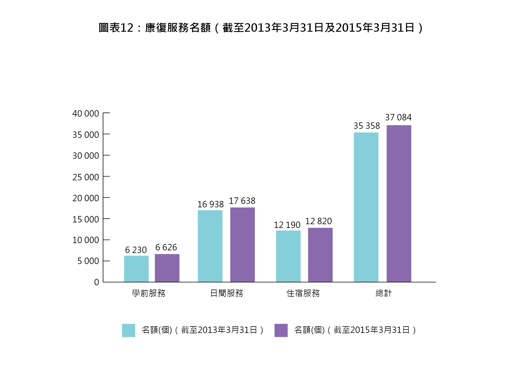 為達到以上目標,社署透過撥款資助非政府機構,為殘疾人士提供全面的社會康復服務。截至2015年3月底,全港共設有6 626個學前服務名額、17 638個日間服務名額及12 820個住宿服務名額。截至2015年3月31日服務名額的分項數字載於下表,截至2013年3月31日及2015年3月31日的康復服務名額則載於圖表12。