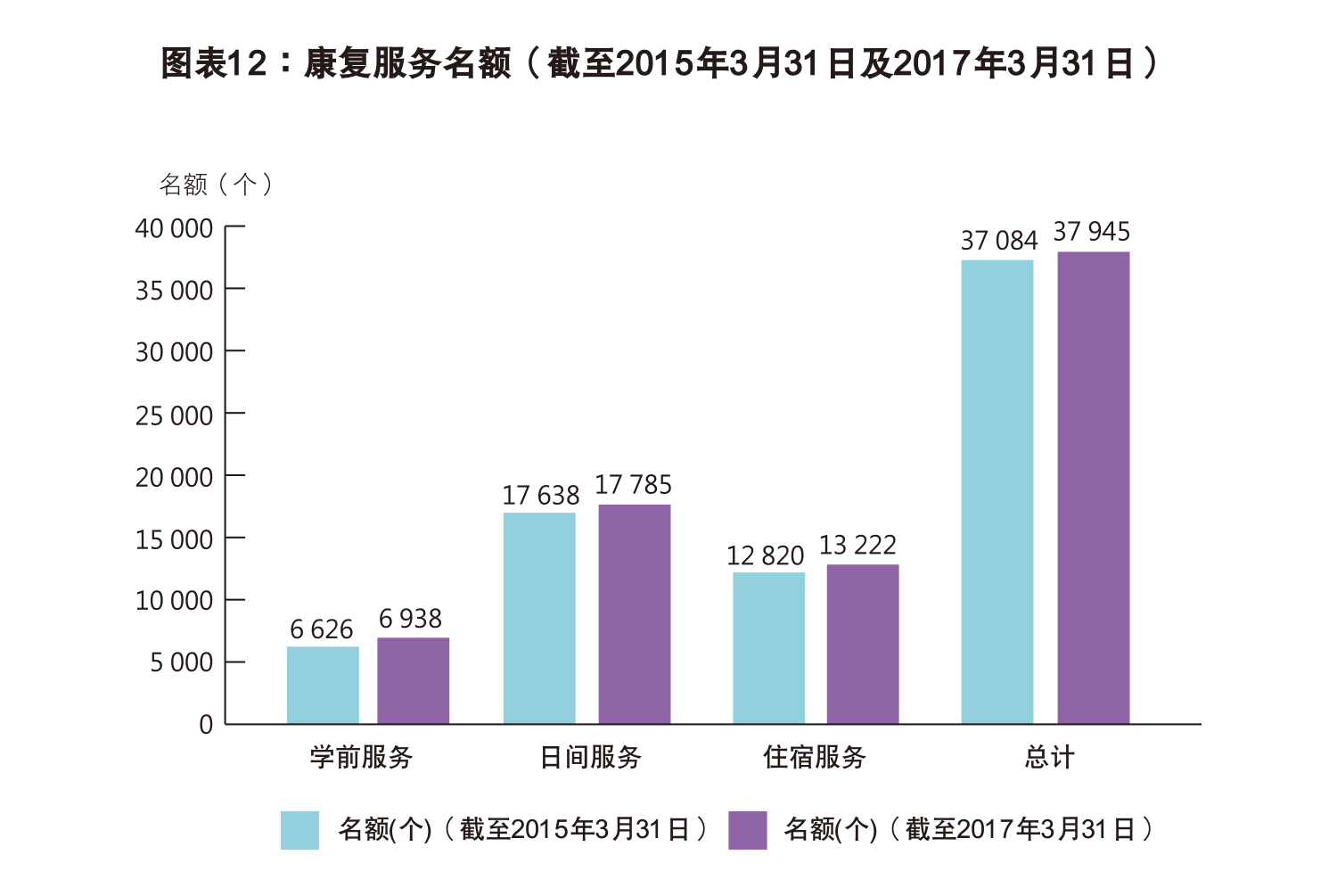 为达到以上目标,社署拨款资助非政府机构,为残疾人士提供全面的社会康复服务。截至2017年3月底,全港共设有6 938个学前服务名额、17 785个日间服务名额及13 222个住宿服务名额。截至2017年3月31日服务名额的分项数字载于下表,截至2015年3月31日及2017年3月31日的康复服务名额则载于图表12。