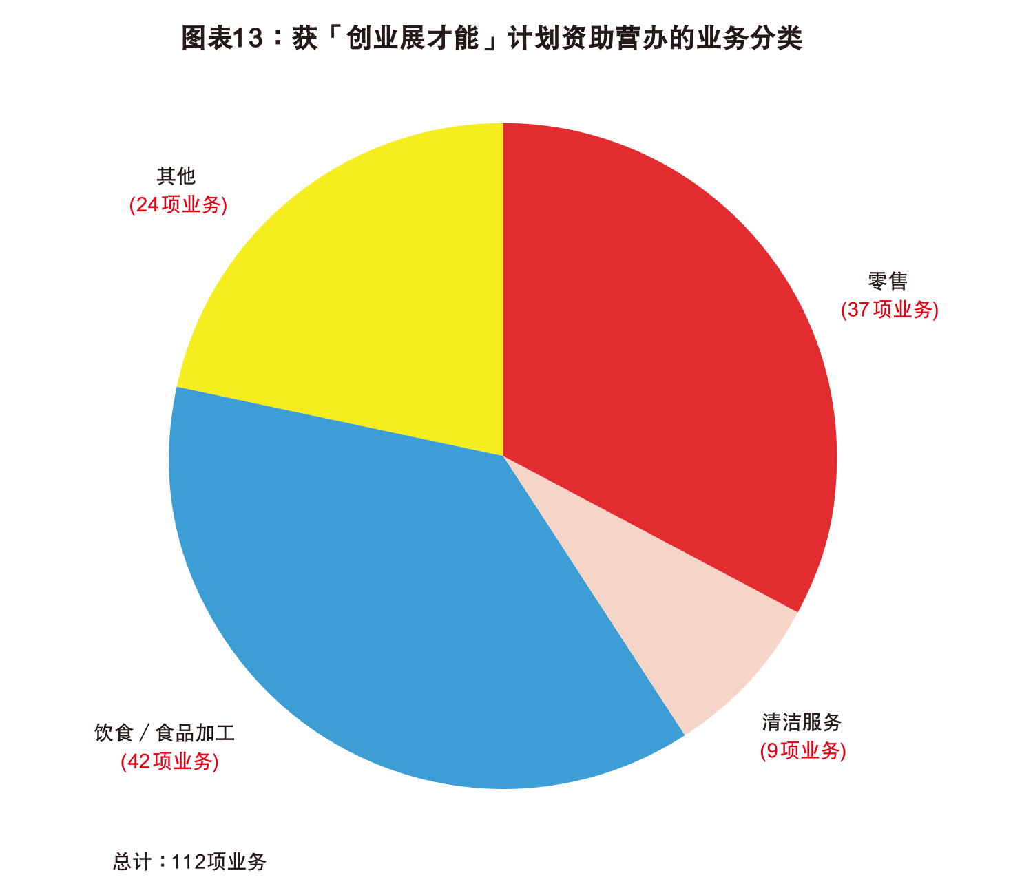 - 「创业展才能」计划旨在直接为残疾人士创造职位,增加他们的就业机会。计划向非政府机构提供一笔种子基金,供其营办小型业务,条件是每项业务的受薪雇员总数中,须有不少于50%为残疾人士。截至2017年3月31日,「创业展才能」计划已资助112项业务,包括清洁、饮食、生态旅游、汽车美容、盲人按摩、零售店服务、蔬果批发及加工等。这些业务共创造了约1 162个就业机会,当中包括约819个为残疾人士而设的职位。业务分类如下(图表13):