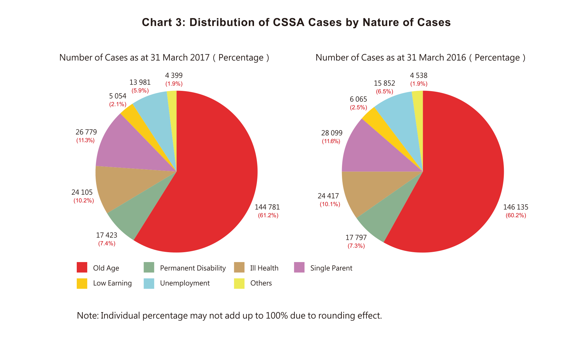 As at 31 March 2016, there were 242 903 CSSA cases providing assistance to 360 393 people. The number of CSSA cases and recipients were 236 522 and 346 709 respectively as at 31 March 2017. The number of CSSA cases decreased in the past two years. Analysis of distribution of CSSA cases by nature of cases as at 31 March 2016 and 31 March 2017 respectively is shown in Chart 3 below: