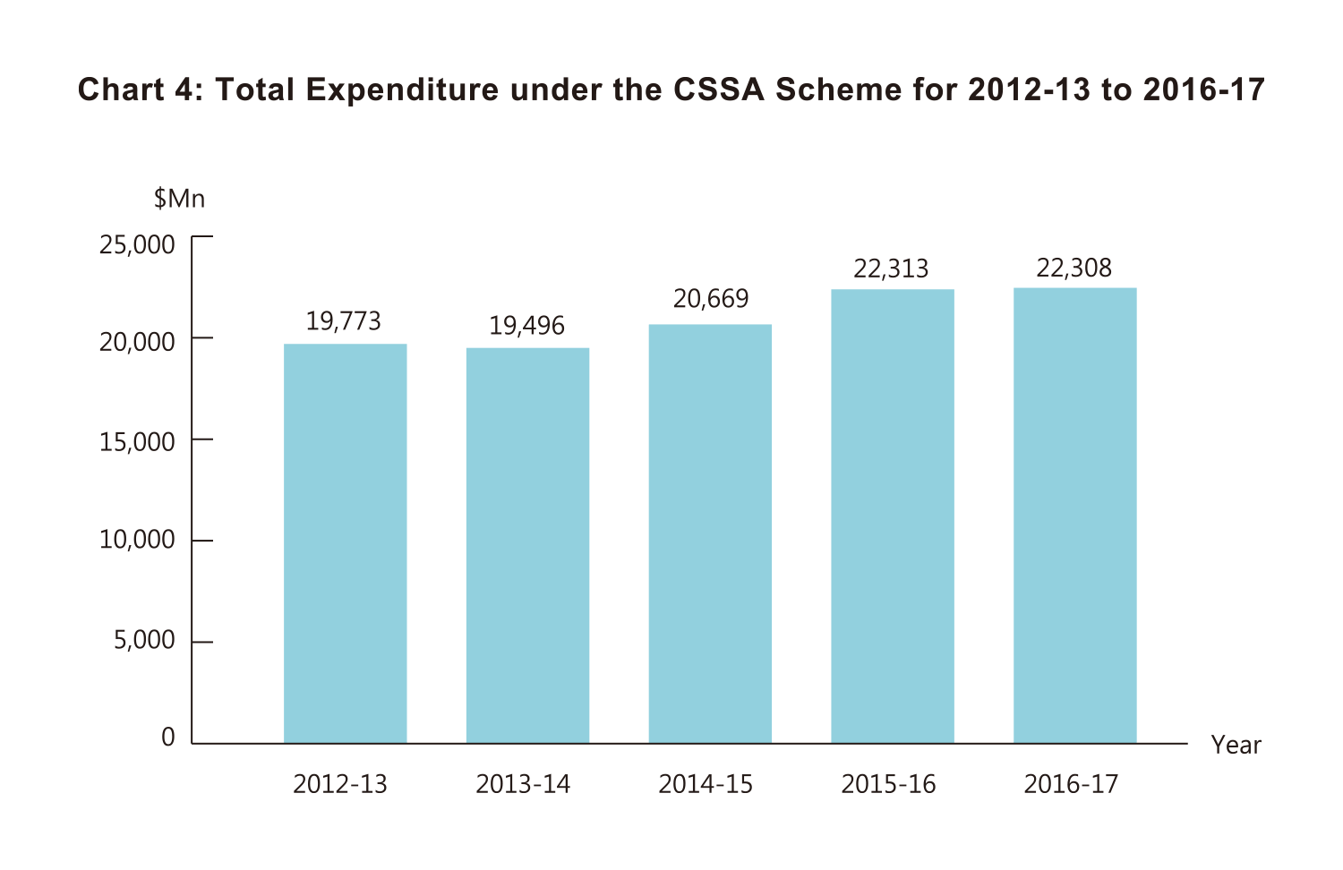 A total of $22,308 million was paid out under the CSSA Scheme in 2016-17. The total expenditure for the years 2012-13 to 2016-17 is shown in Chart 4 below: