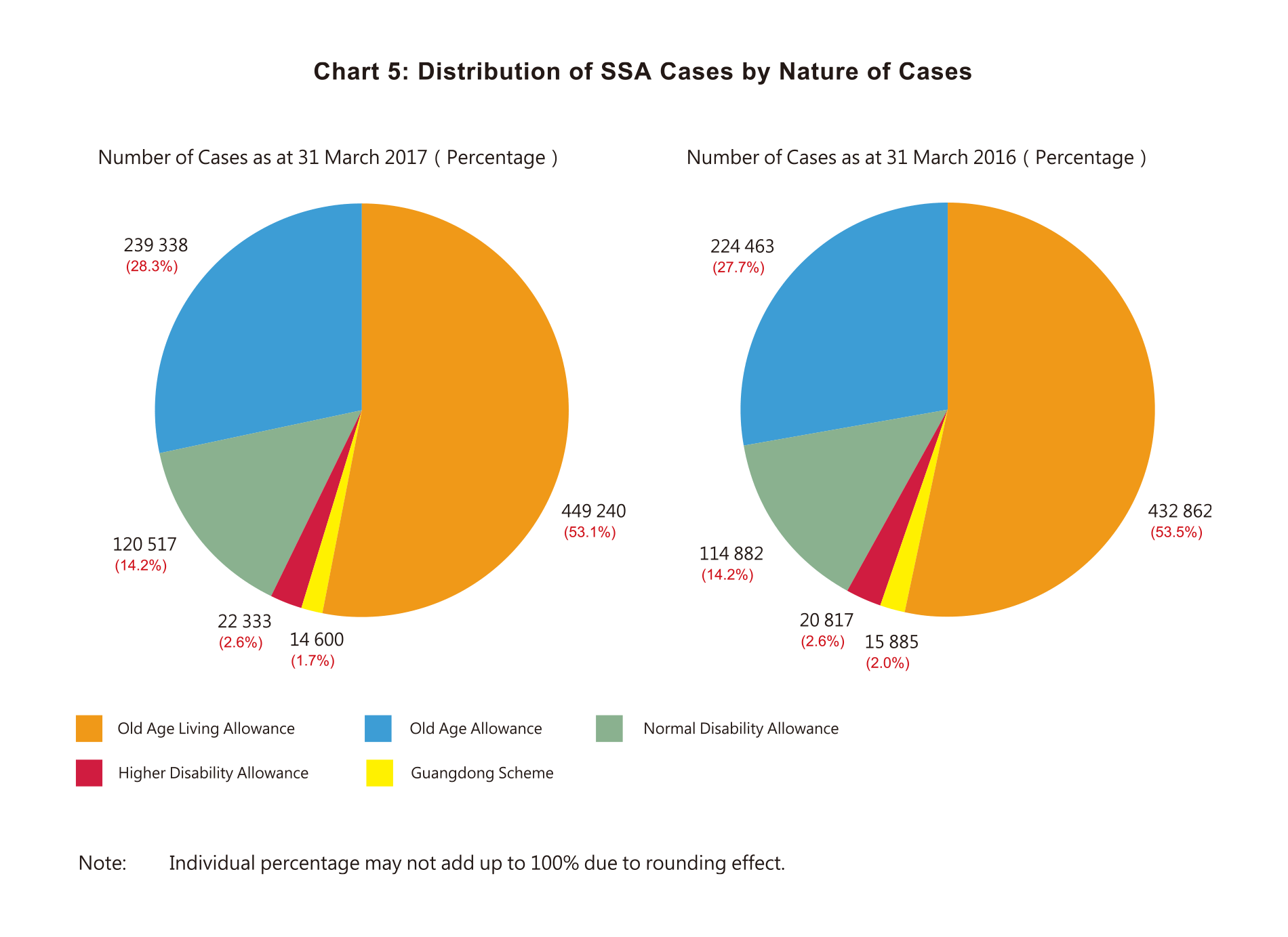 As at 31 March 2016 and 2017, the numbers of SSA cases were 808 909 and 846 028 respectively. A breakdown of these cases by nature of cases is shown in Chart 5 below: