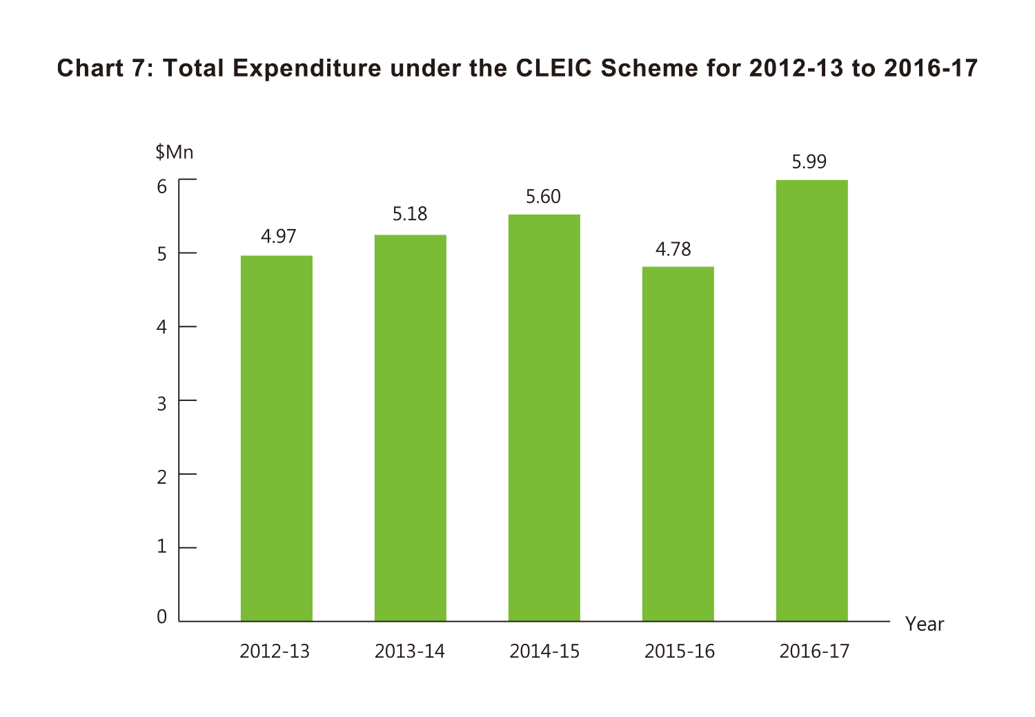 In 2016-17, a total of $5.99 million was paid out under the CLEIC Scheme to 299 cases. The total expenditure for the years 2012-13 to 2016-17 is shown in Chart 7 below: