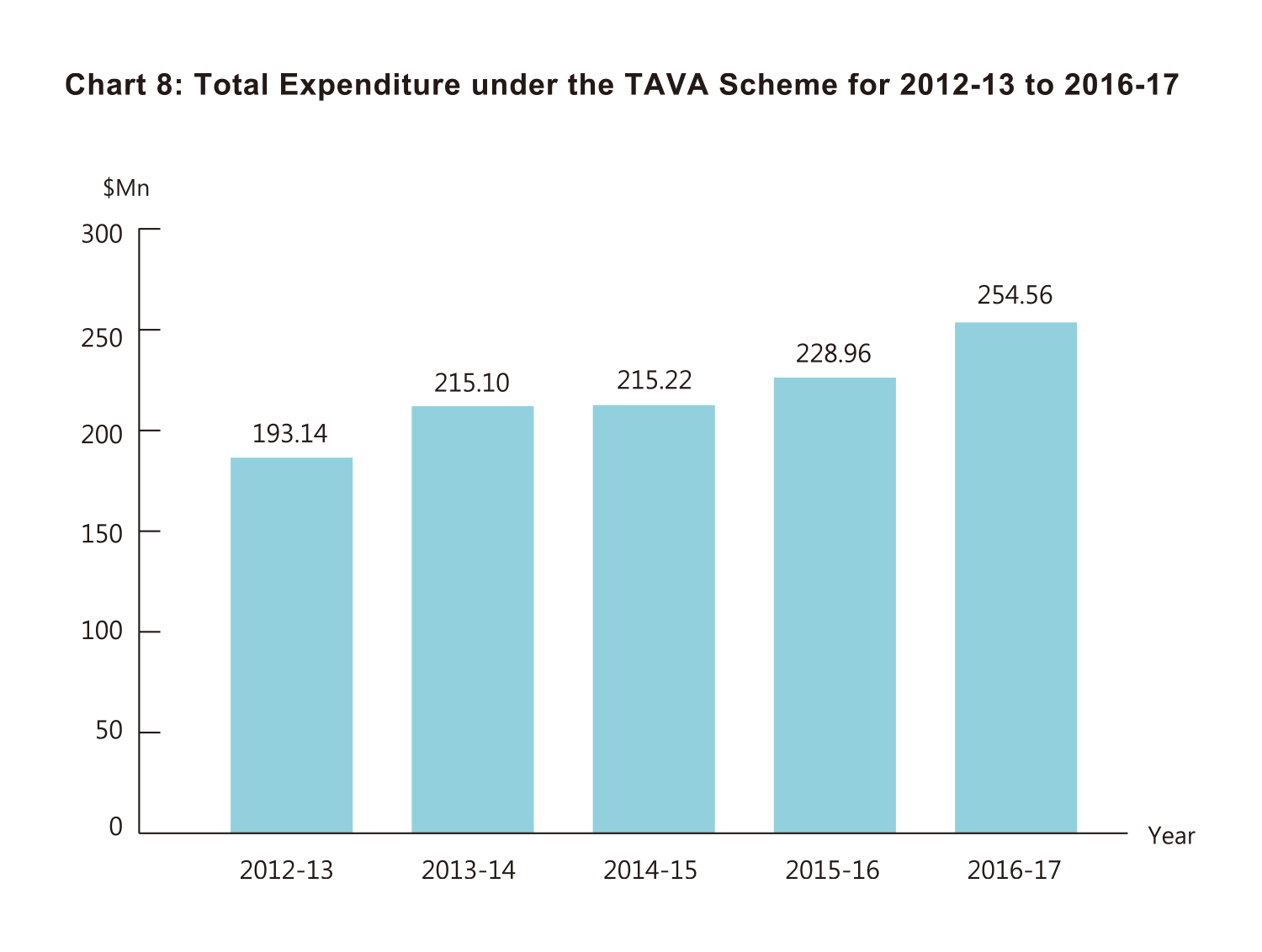 In 2016-17, a total of $254.56 million was paid out under the TAVA Scheme to 12 854 cases. The total expenditure for the years 2012-13 to 2016-17 is shown in Chart 8 below: