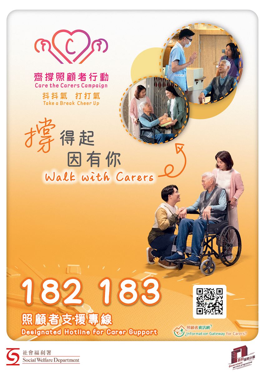 為使社會更了解照顧者的重要性和需要、推廣社區互助,並締造照顧者友善的環境,社署由2023-24年度起展開為期3年的「齊撐照顧者行動」全港宣傳活動。宣傳活動包括製作電視宣傳短片、錄製電台宣傳聲帶、製作宣傳物品、舉行大型焦點活動,以及在公共交通工具登廣告等。 社署轄下各地區福利辦事處亦會因應各區特色,與提供安老和康復服務的非政府機構和地區團體合辦以支援照顧者為主題的活動和公眾教育活動,共同推動照顧者支援,為照顧者提供實際援助。